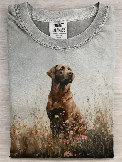 Funny Moody Dark Wildflower Chocolate Labrador Dog Art Print Casual Cotton Short Sleeve T-shirt
