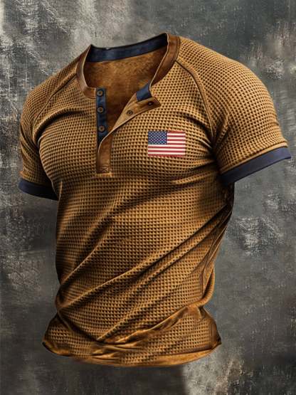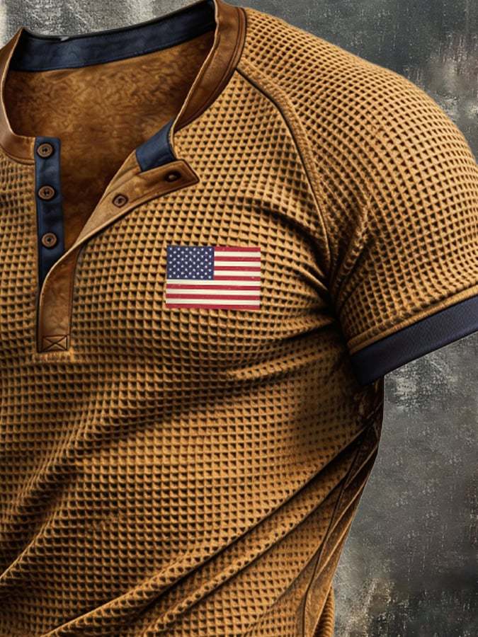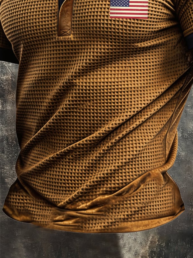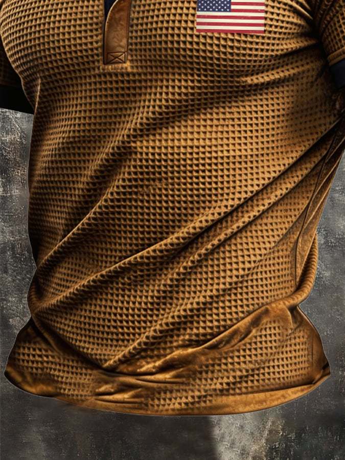 Men's Retro Knitted 3D Square-Grid T-Shirt with Leather Paneling and Henley Collar