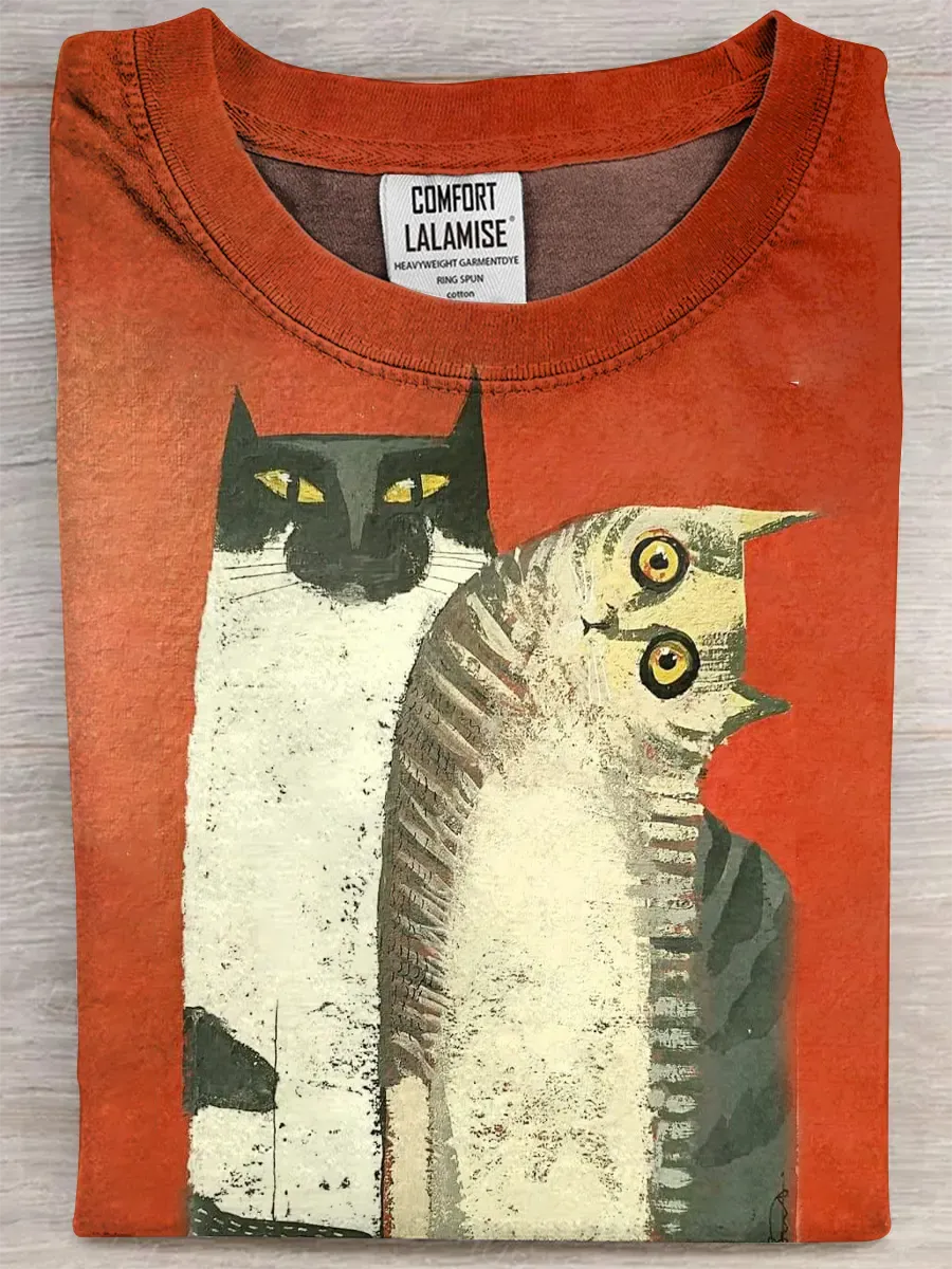Retro Cat Art Print Casual Pure Cotton Short Sleeved T-shirt