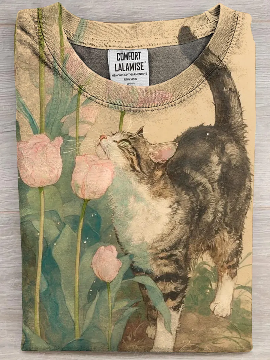 Retro Flowers Cat Art Print Casual Pure Cotton Short Sleeved T-shirt
