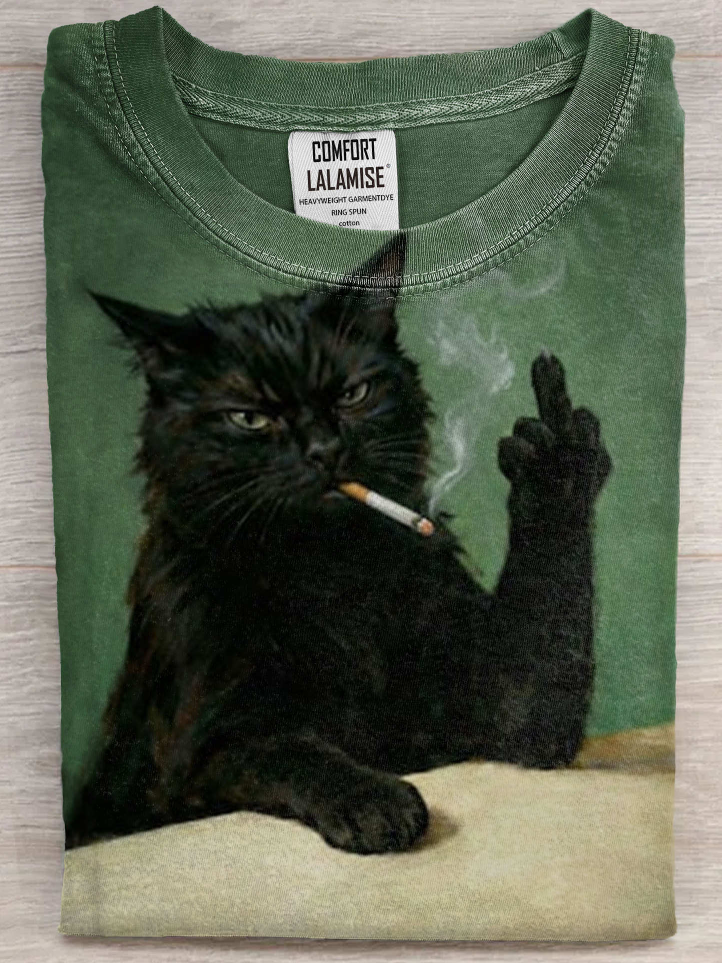 Moody Cat Smoking Art Print Casual Short Sleeve T-shirt