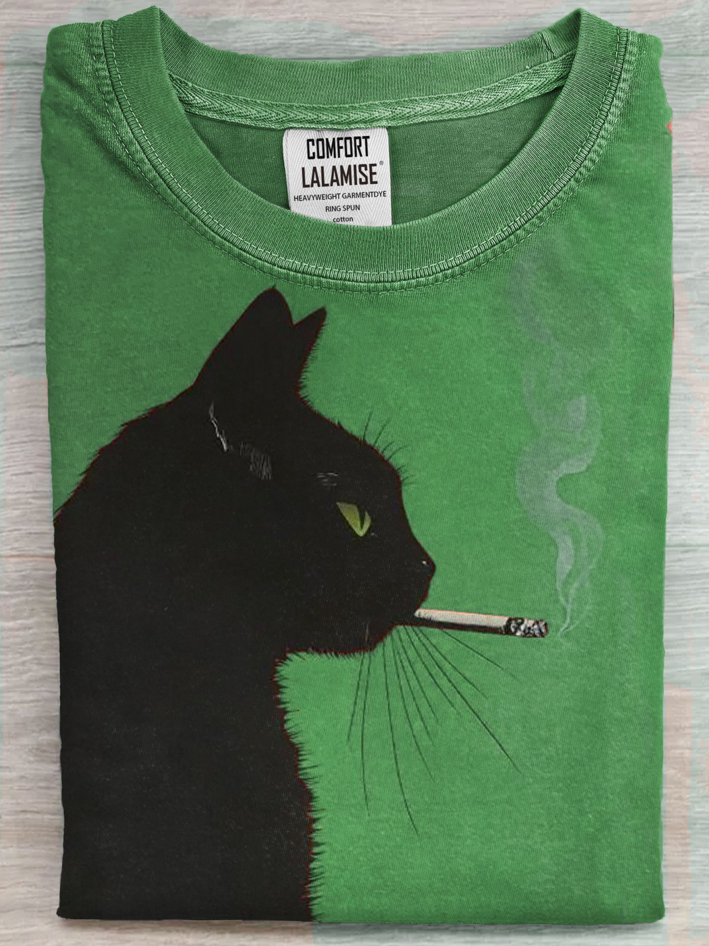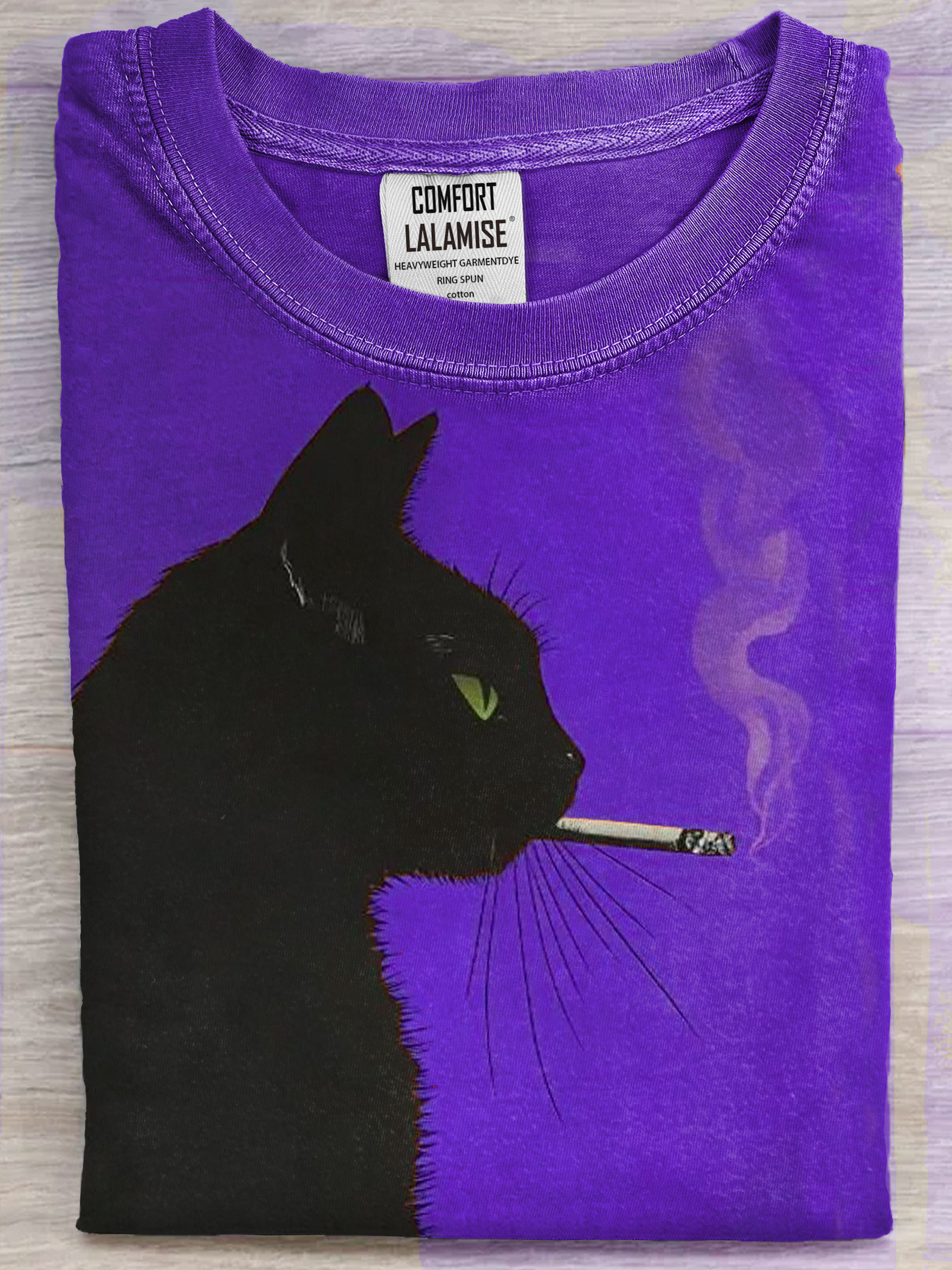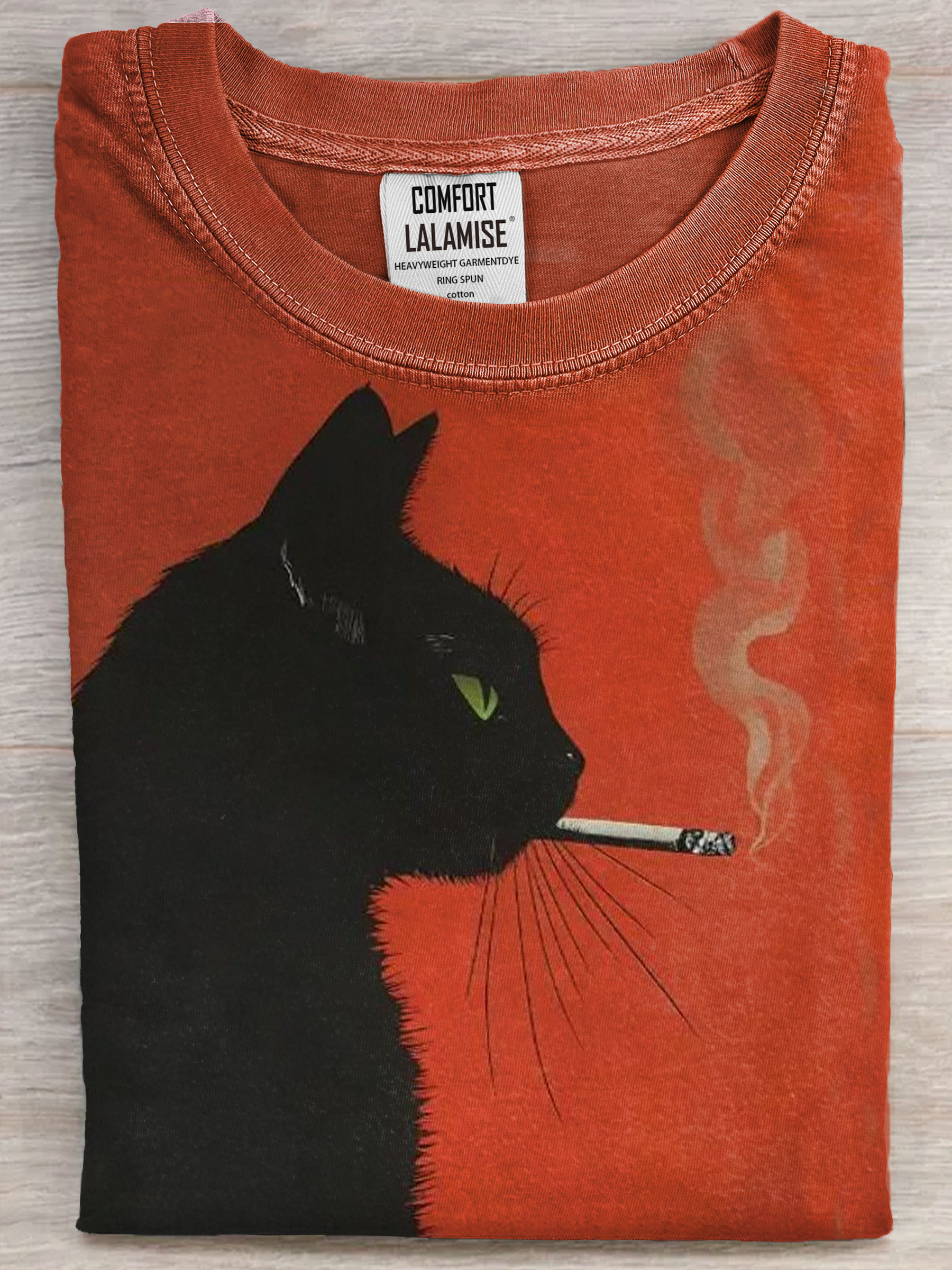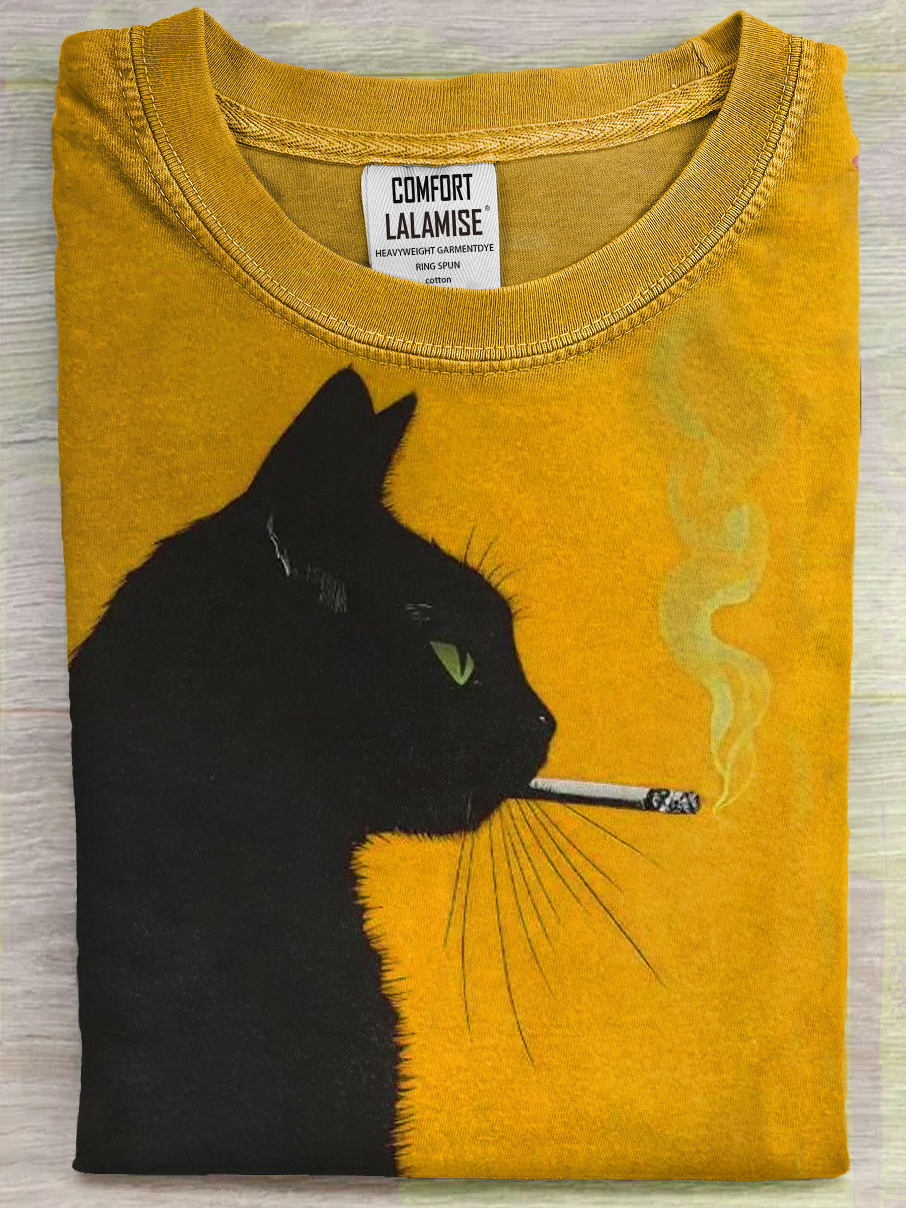 Black Cat Smoking a Cigarette Vintage Art Print Casual Short Sleeve T-shirt