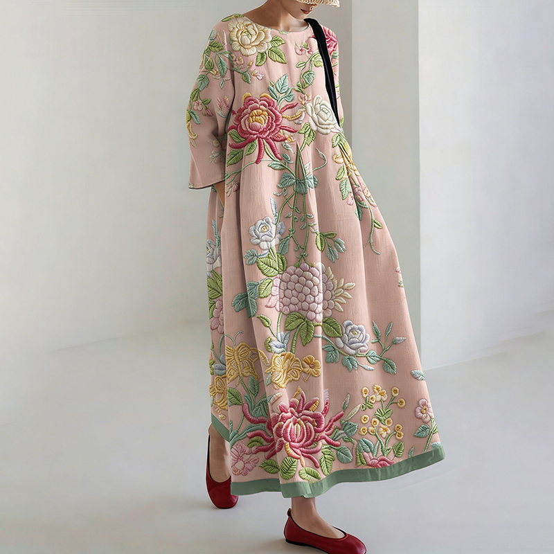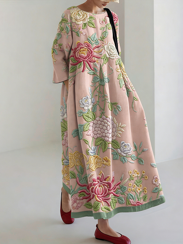 Women's Vintage Japanese Floral Print Round Neck Linen Blend Midi Dress – lolonb
