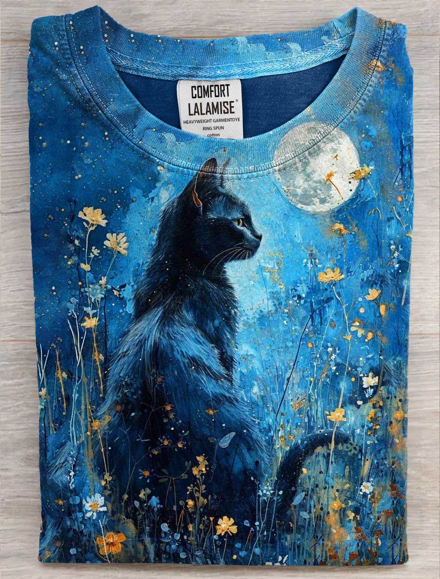 Black Cat In The Moonlight Art Print Casual Short Sleeve T-shirt