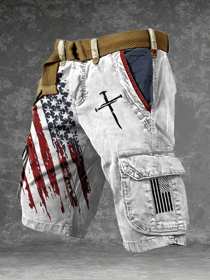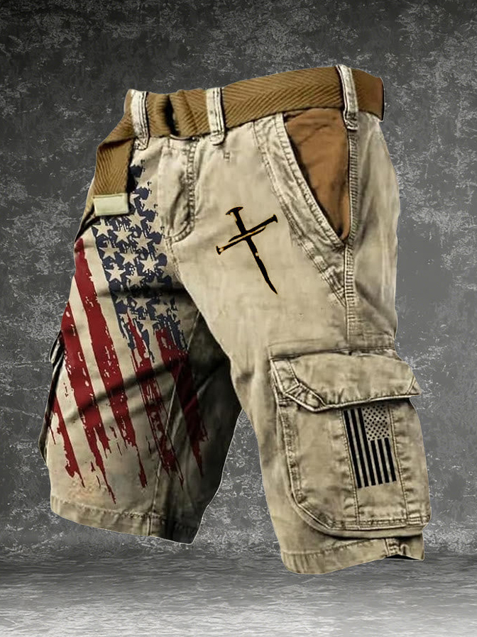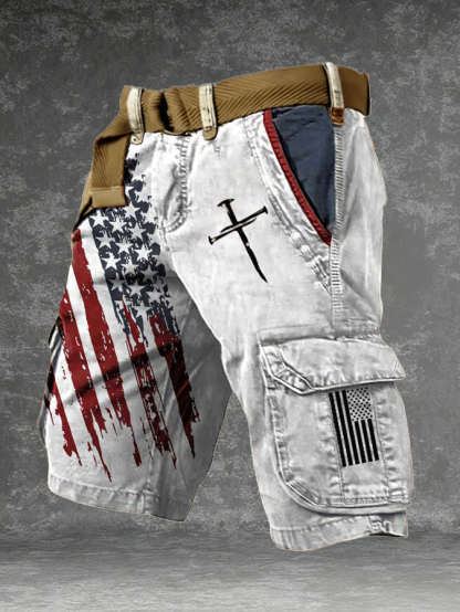 Men's American Flag Nail Cross Print Denim-Like Cargo Shorts