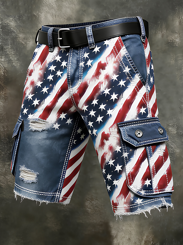 Men's Stars Stripes American Flag Ripped Print Denim-Like Cargo Shorts