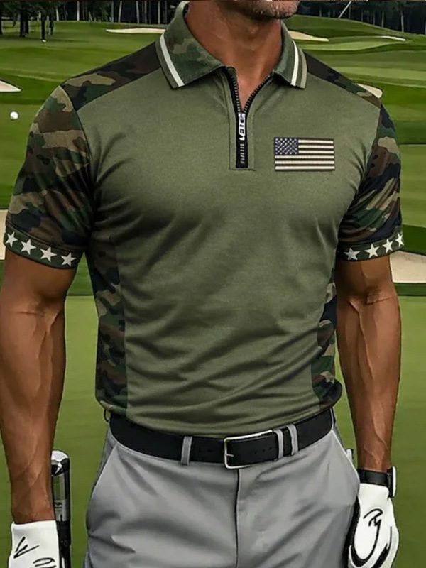 Men's USA Flag Stars Camo Print Zipper Polo Shirt