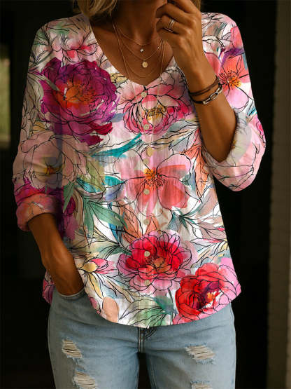 Women's Retro Flower Art Print Linen Cotton Shirt