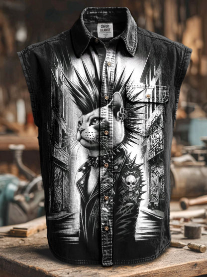 Fuck Cat Art Print Casual 100% Cotton Sleeveless Lapel Shirt