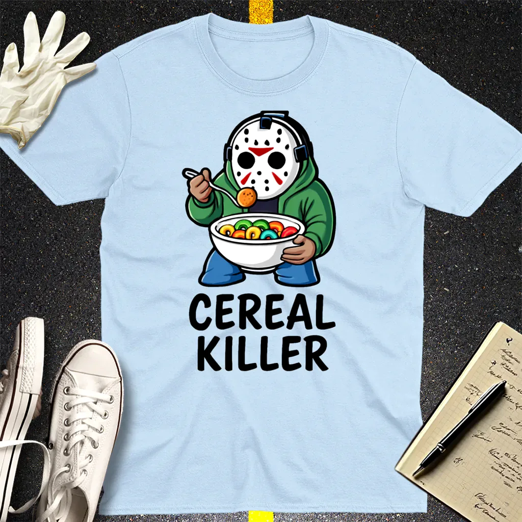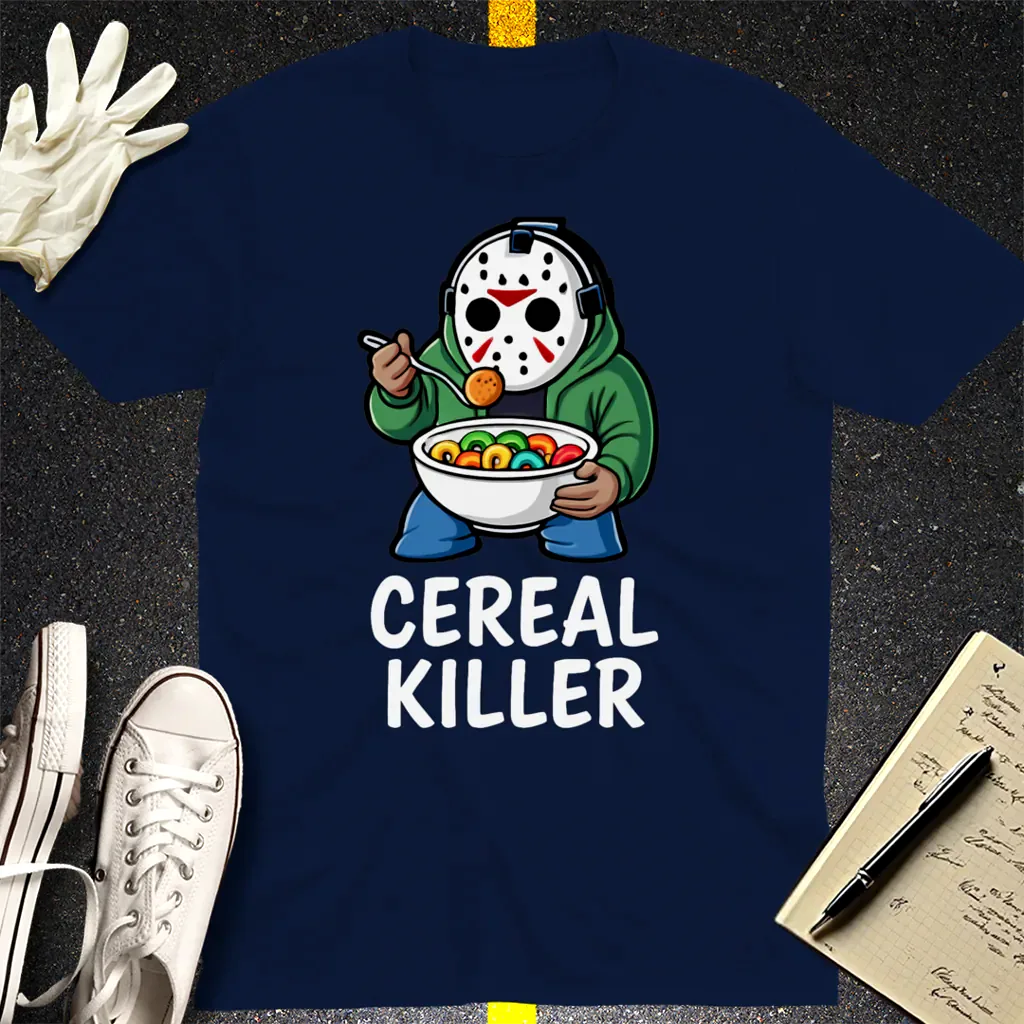 Start your day with a killer laugh! This hilarious 'Cereal Killer' T-Shirt features a cartoon masked character enjoying a bowl of colorful cereal. A fun and playful twist on horror icons, it's the perfect conversation starter for breakfast lovers and humor fans alike.