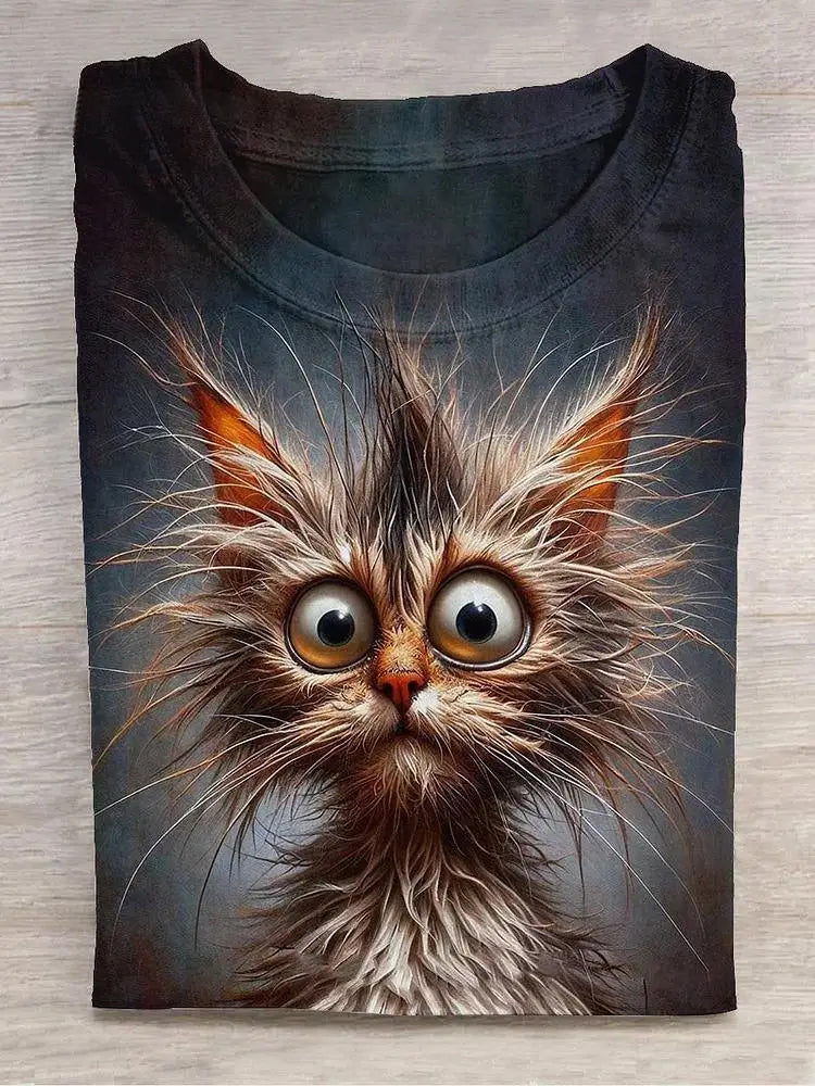 Crazy Cat Art Print Short Sleeve Casual T-shirt