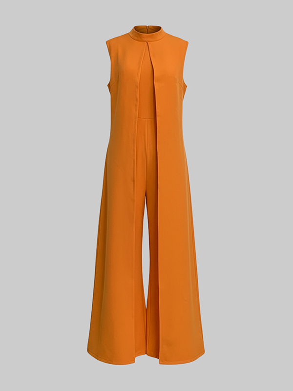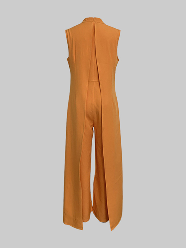 High Waisted Loose Pockets Solid Color Round-Neck Jumpsuits