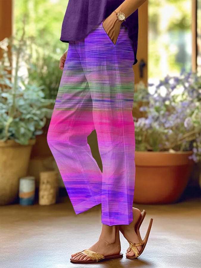 Women's Casual Retro Purple Floral Print Cotton and Linen Pants (With Pockets)