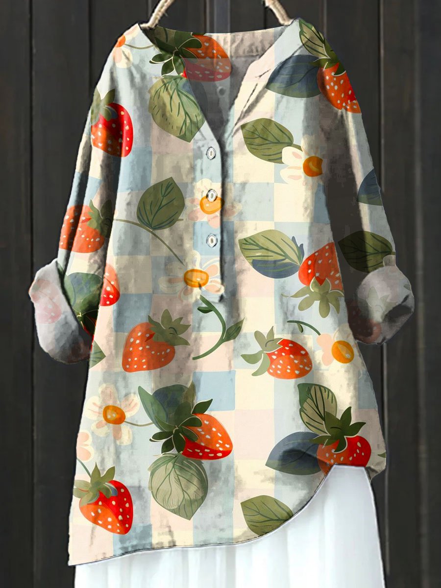 Women's Vintage Lovely Strawberry Art Print Casual Cotton And Linen Shirt
