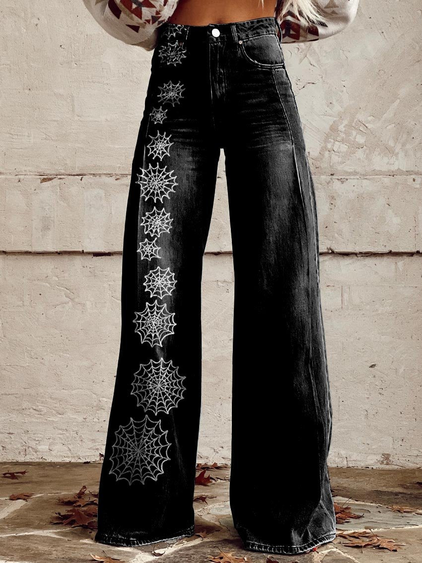 Women's Black Spider Web Print Casual Wide Leg Pants