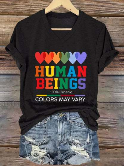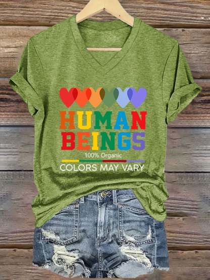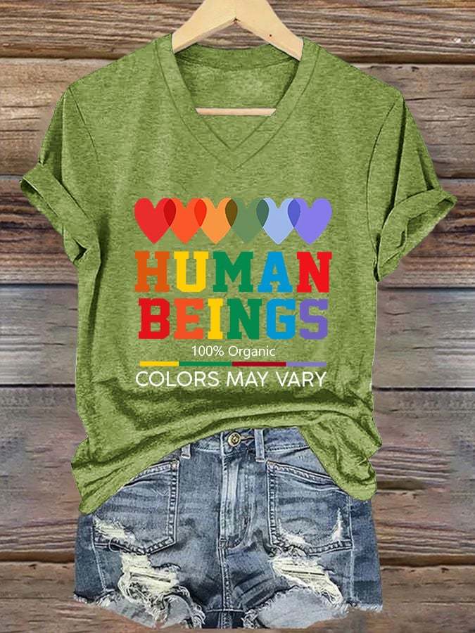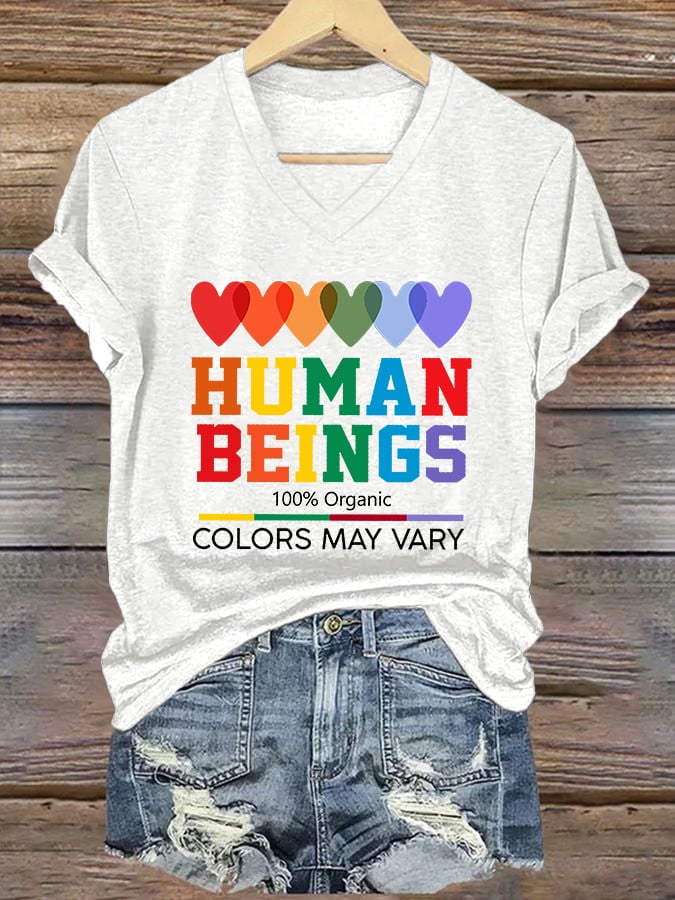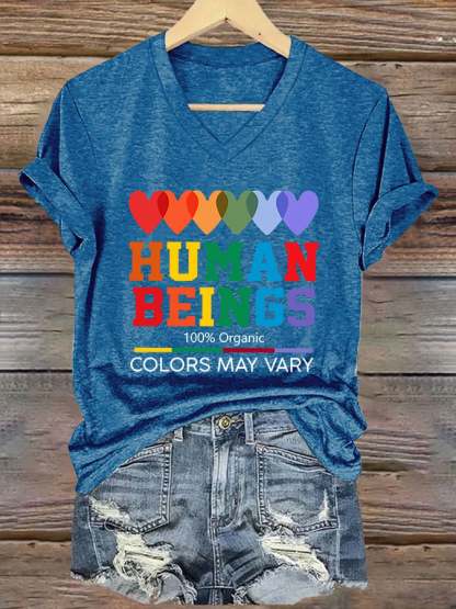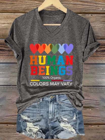 V-Neck Retro Pride Rainbow Love Heart Human Beings 100% Organic Colors May Vary Human Rights Equality Pride Print T-Shirt
