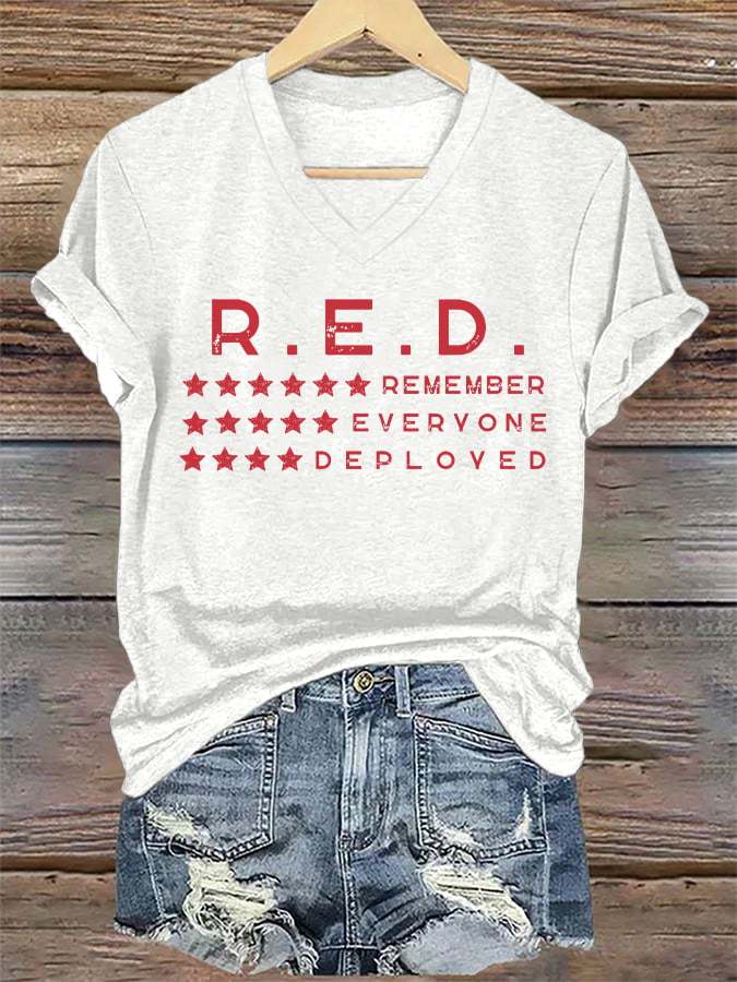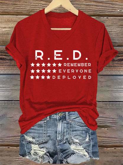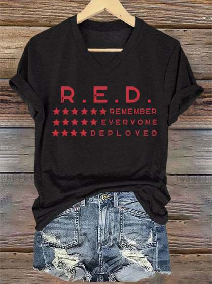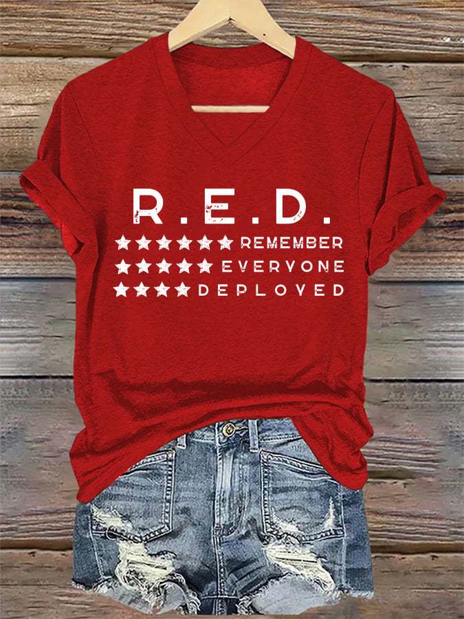 Women's On Fridays We Wear RED Remember Everyone Deployed Print V Neck T-shirt