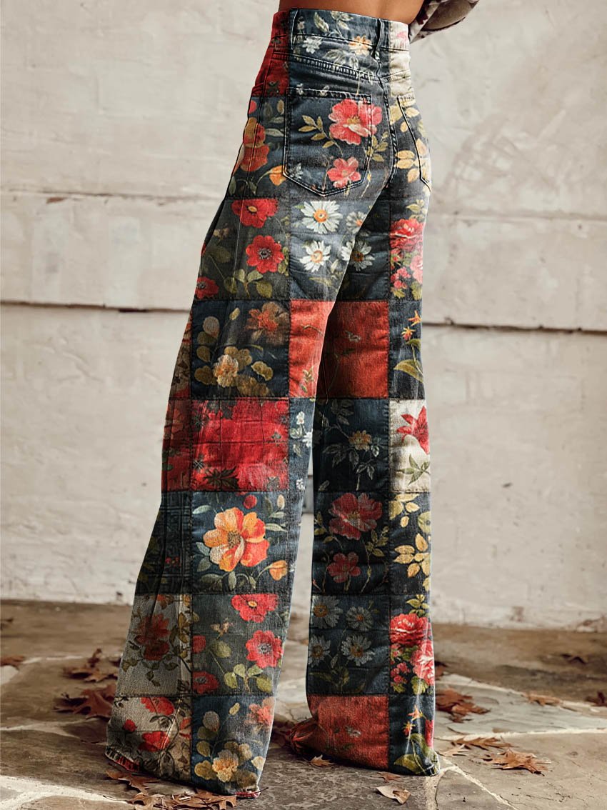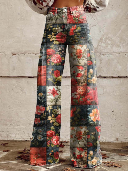 Women's Colorful Flower Print Casual Wide Leg Pants