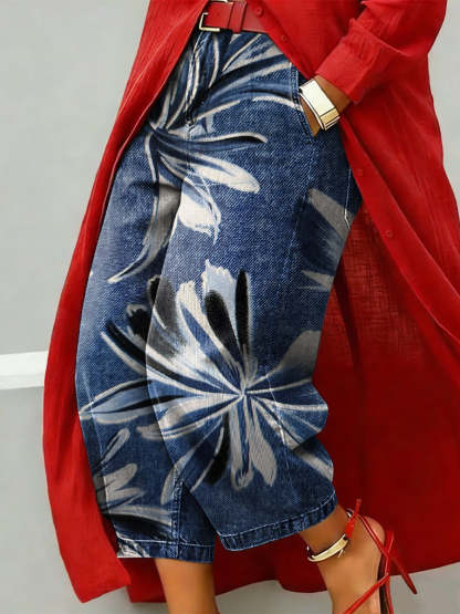 Women's Free-spirited Floral Decorative Pattern Denim Pants