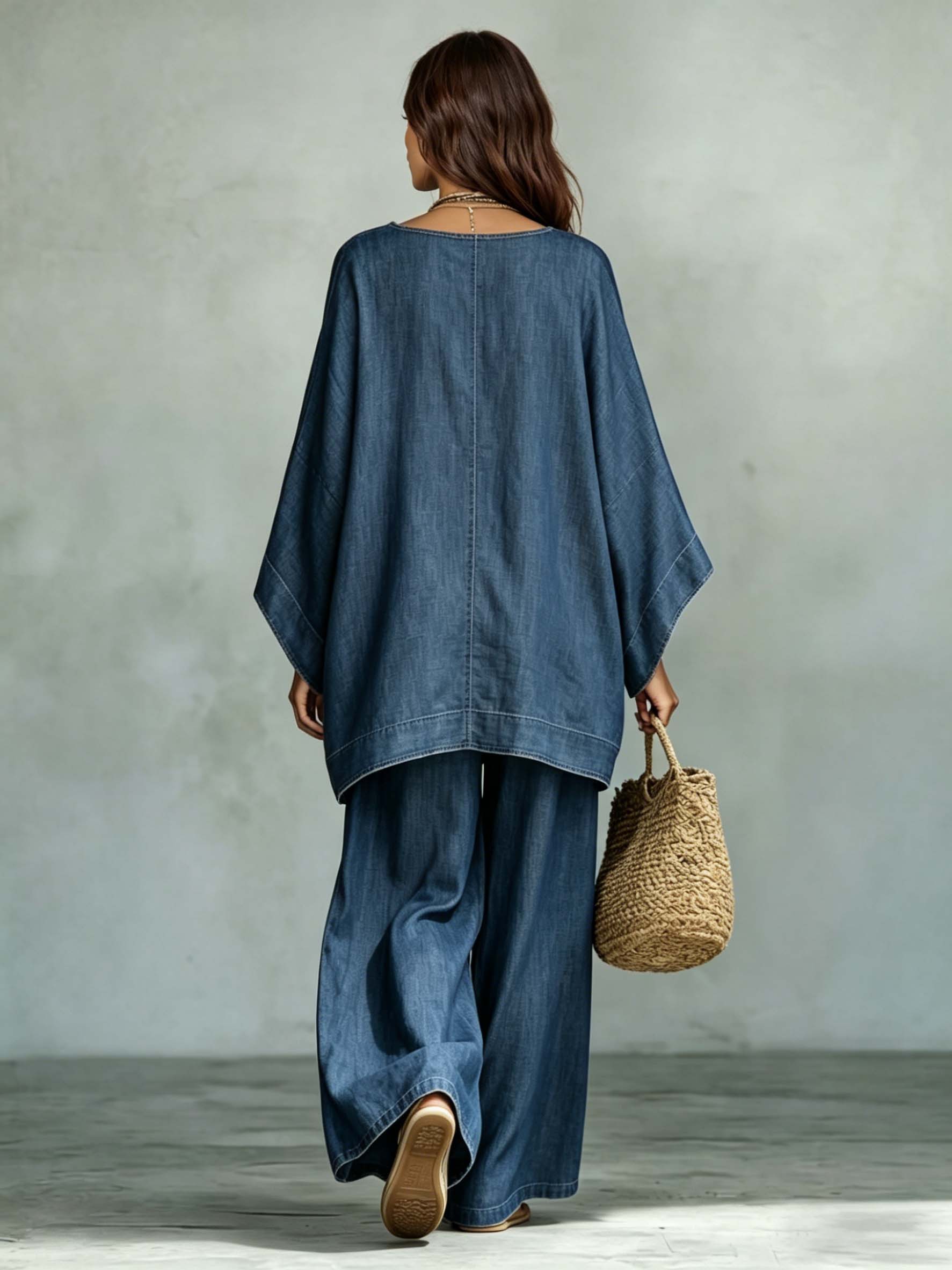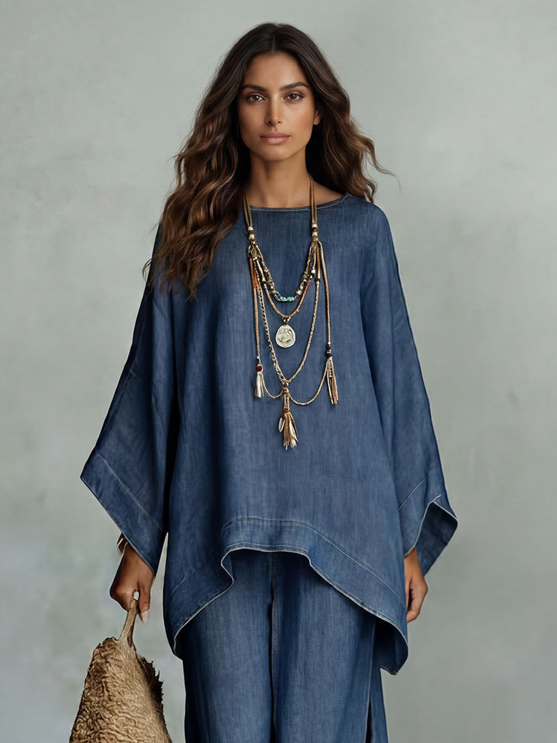Avslappnad tvådelad set med en denim batwing ärm asymmetrisk topp och flödande vida byxor. Bekväm och stilren, perfekt för vardagsbruk och avslappnade utflykter.
