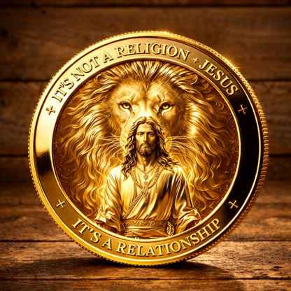 The front side features Jesus Christ with the powerful image of a roaring lion behind him. The words "It’s Not a Religion, It’s a Relationship" serve as a reminder that faith in Jesus Christ is not about mere religion, but a personal and dynamic relationship with the Savior. This design speaks to those who know the strength of belief is not in outward displays, but in the quiet strength of a heart aligned with Christ. This side reminds us: