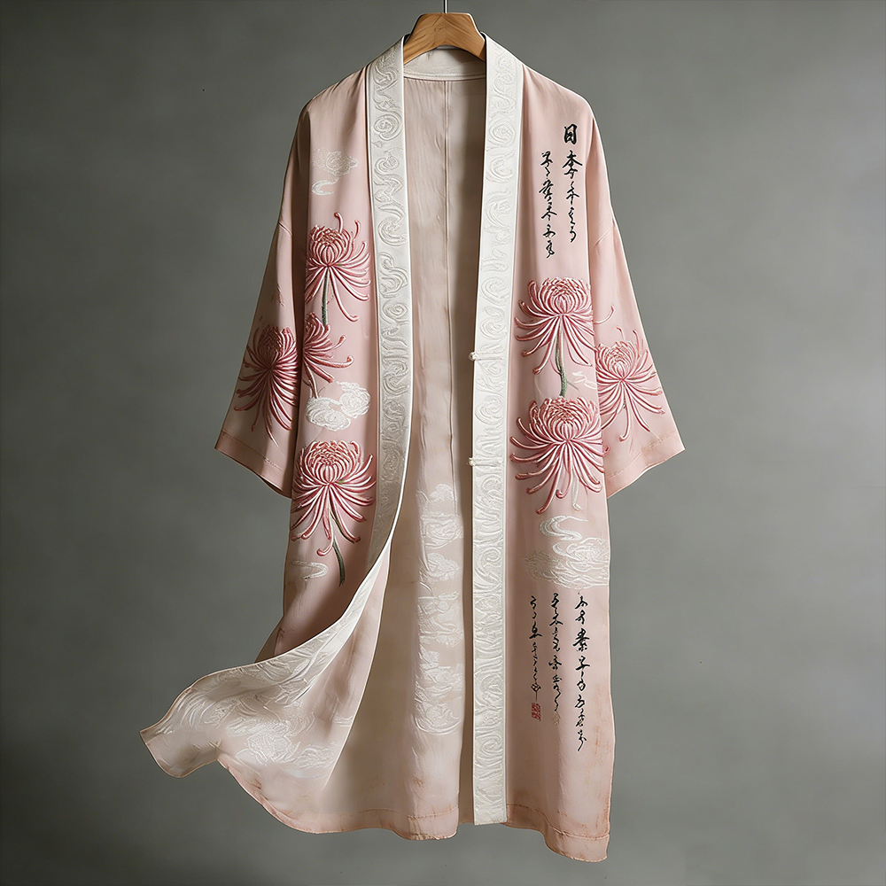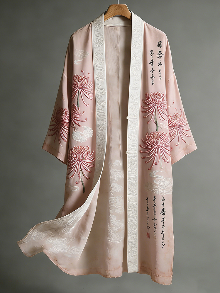 Japanese-style Chrysanthemum And Calligraphy Art Pink Embroidered Distressed Kimono – lolonb