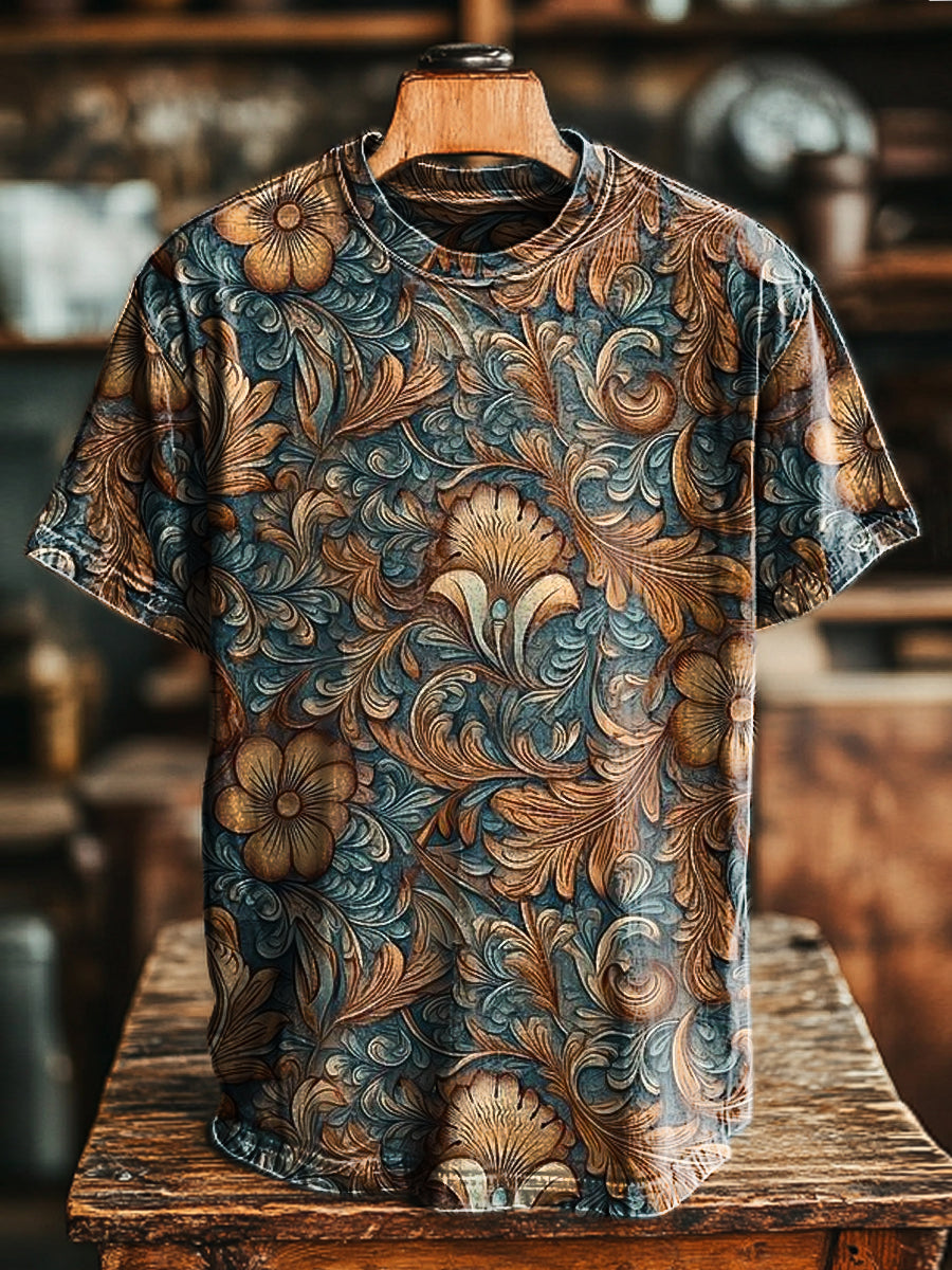 Men's Vintage Western Floral Art Print Round Neck Short Sleeve T-Shirt