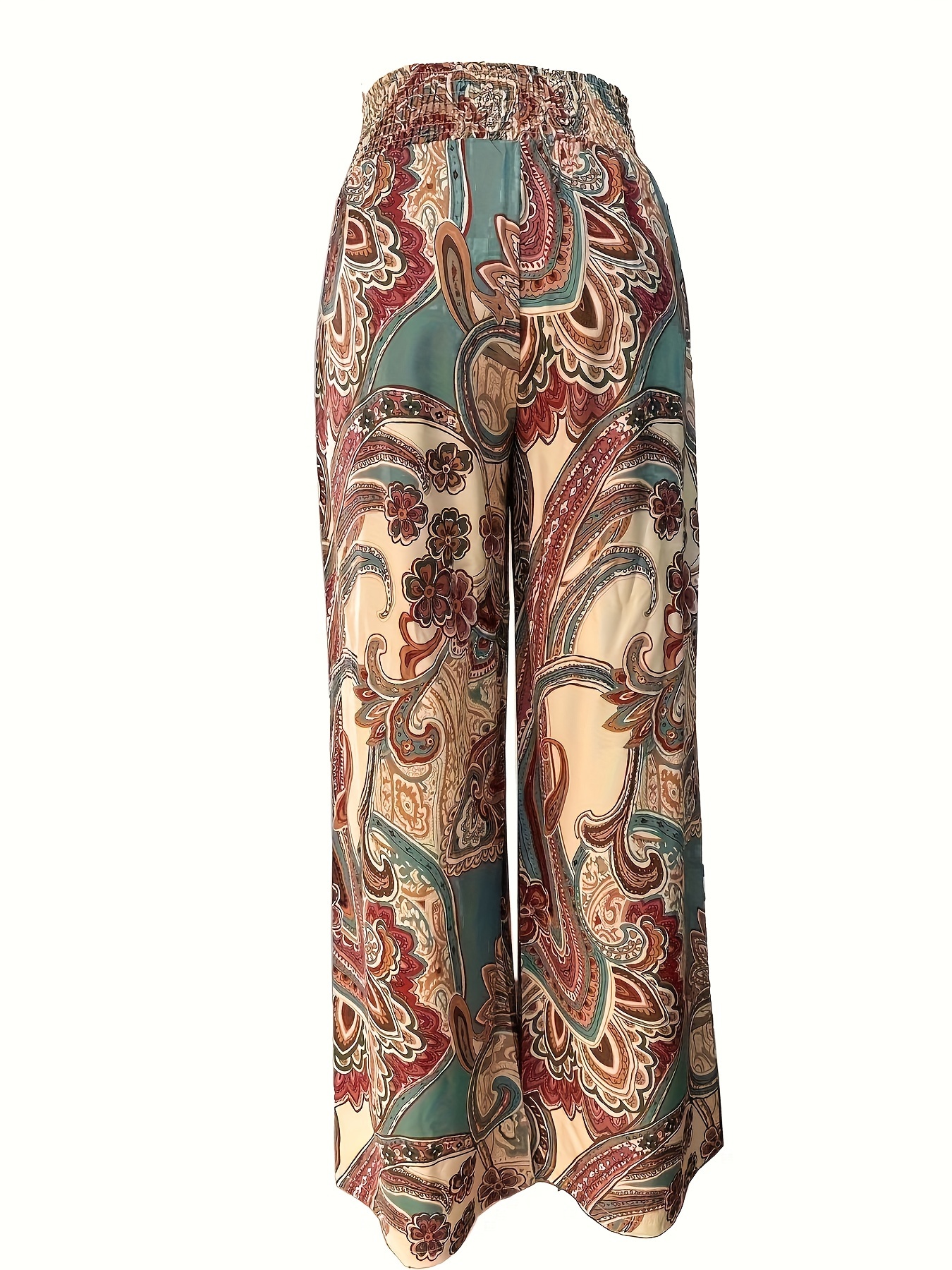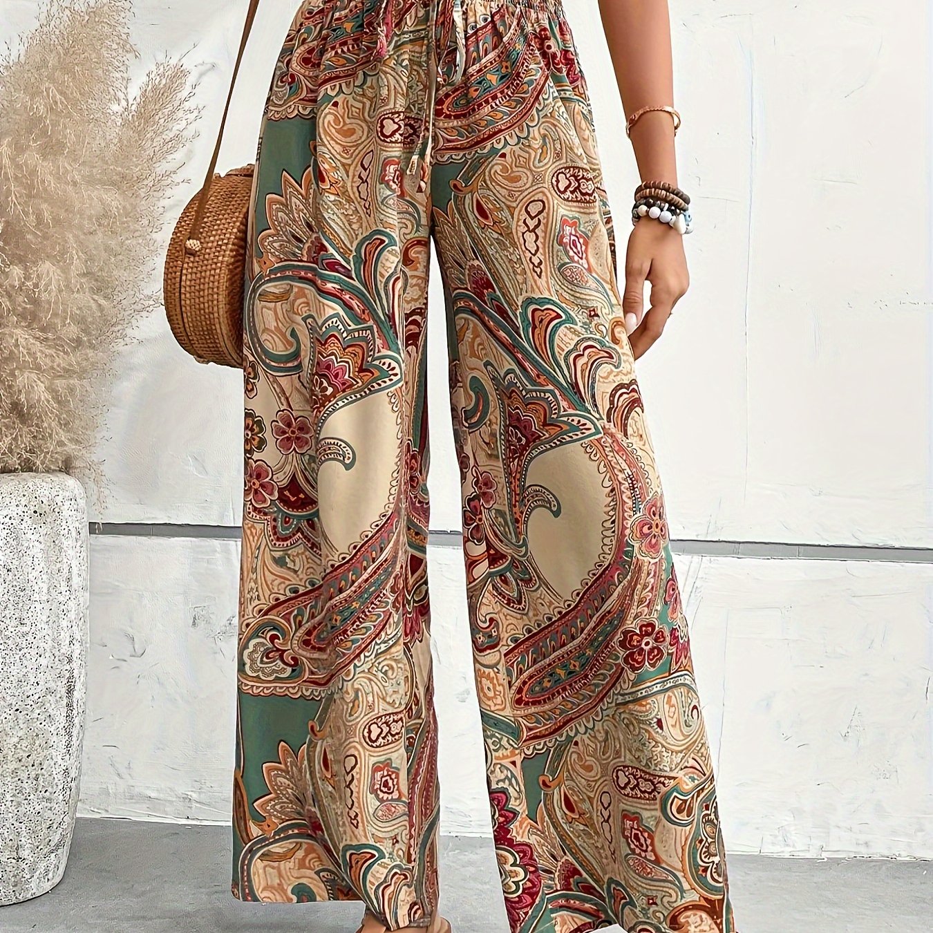 Paisley Print Tie Waist Pants, Vacation Boho Wide Leg Pants For Spring & Summer, Women's Clothing