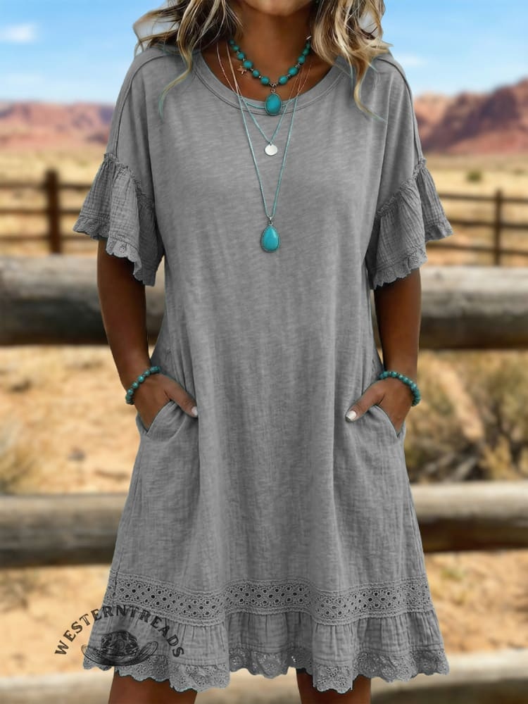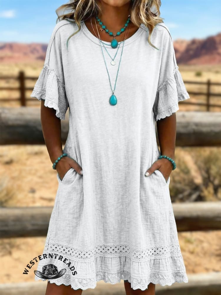 • Design : Western boho style, round neck, ruffle lace sleeves, eyelet lace hem.