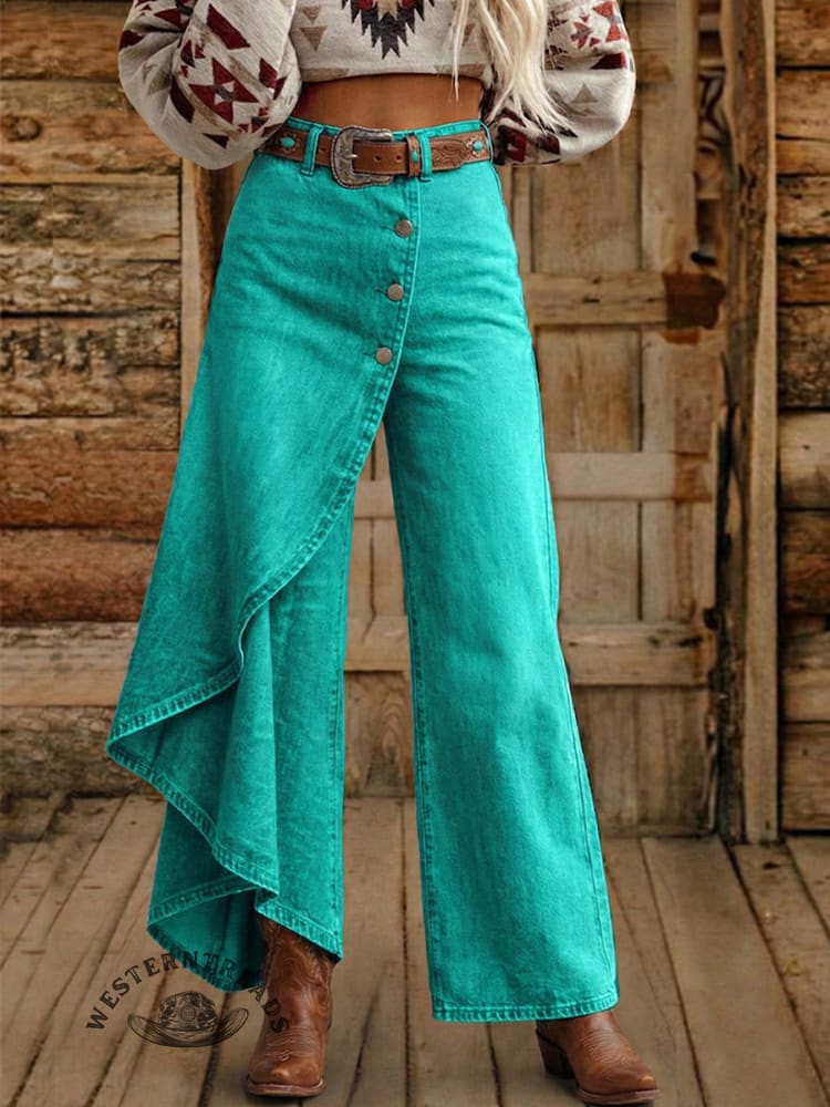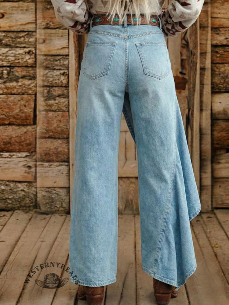 The Ultimate Western Statement Piece Turn heads in the denim that’s taking the "Coastal Cowgirl" trend to the next level. Part wide-leg jean, part flowy maxi skirt, these asymmetric trousers offer a dramatic silhouette without sacrificing comfort.