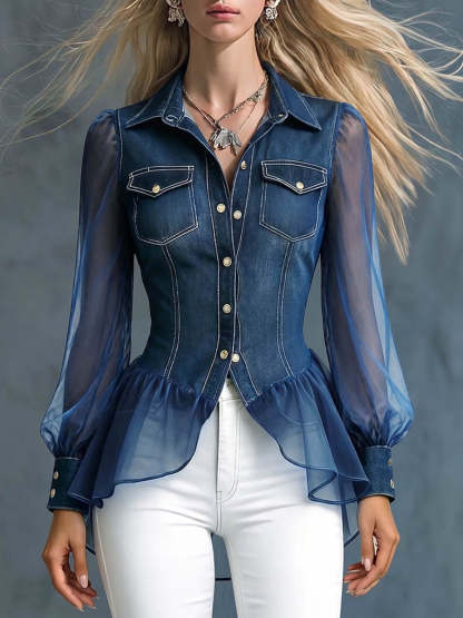 Women's Casual Loose-fit Denim-paneled Top With Lapel Collar And Long Sleeves