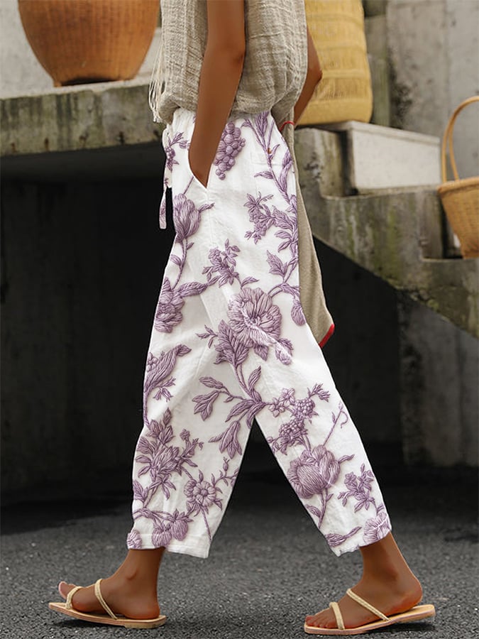 Women's Flower Power Vacation Style Purple Floral Embossed Loose Linen Pants – lolonb