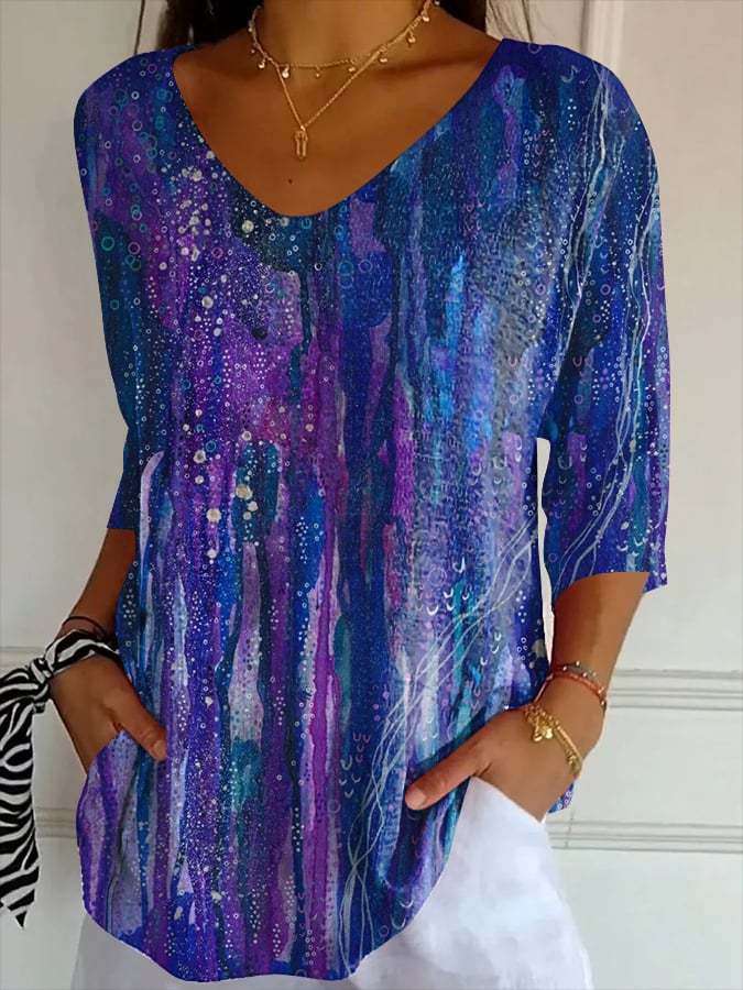 Women's Purple Art Print Striped Fabric Casual V-Neck T-Shirt