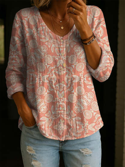 Women's Retro Flower Art Print Linen Cotton Shirt