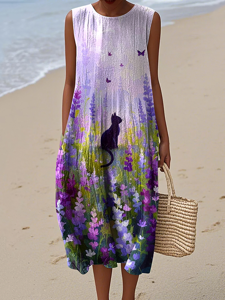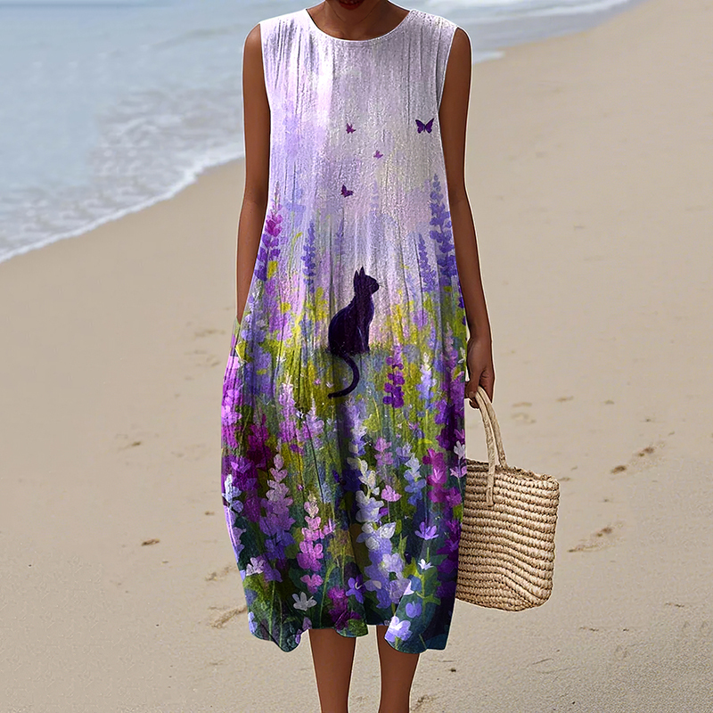 Women's Retro Purple Flowers Cat Art Linen Tank Dress – lolonb