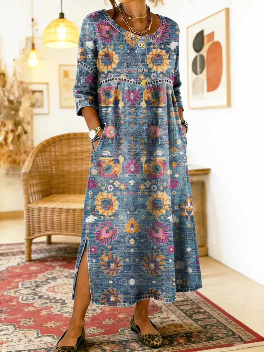 Women's Vintage Ethnic Floral Pattern Art Print Cotton Denim Dress With Lace Trim