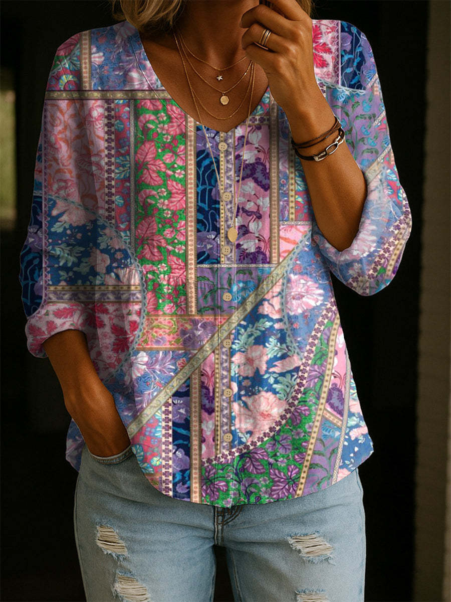 Women's Vintage Flower Art Print Linen Cotton Shirt