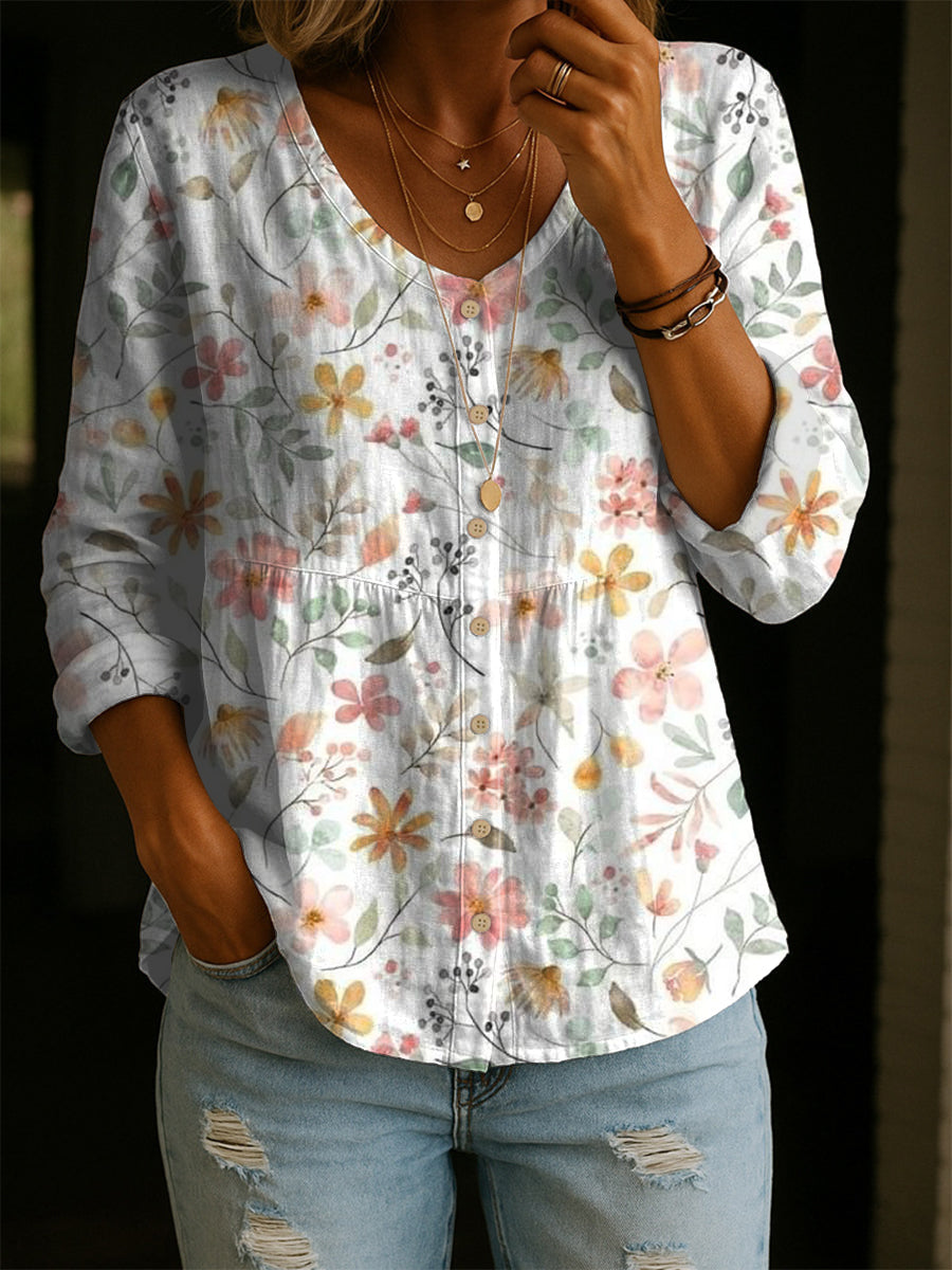 Women's Vintage Flower Art Print Linen Cotton Shirt