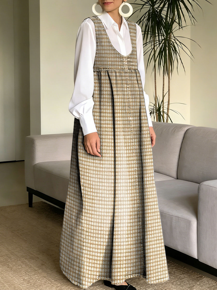 Women's Vintage Minimalist Line Check Pattern Casual Square Collar No Sleeve Dress