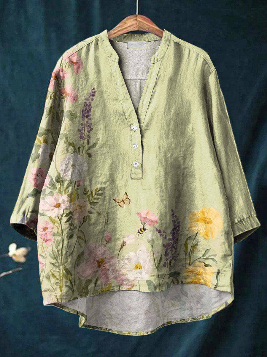 Women's Art Vintage Oil Painting Flower Print Casual Cotton And Linen Ruffle Shirt
