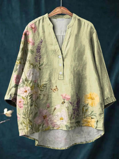 Women's Art Vintage Oil Painting Flower Print Casual Cotton And Linen Ruffle Shirt – lolonb