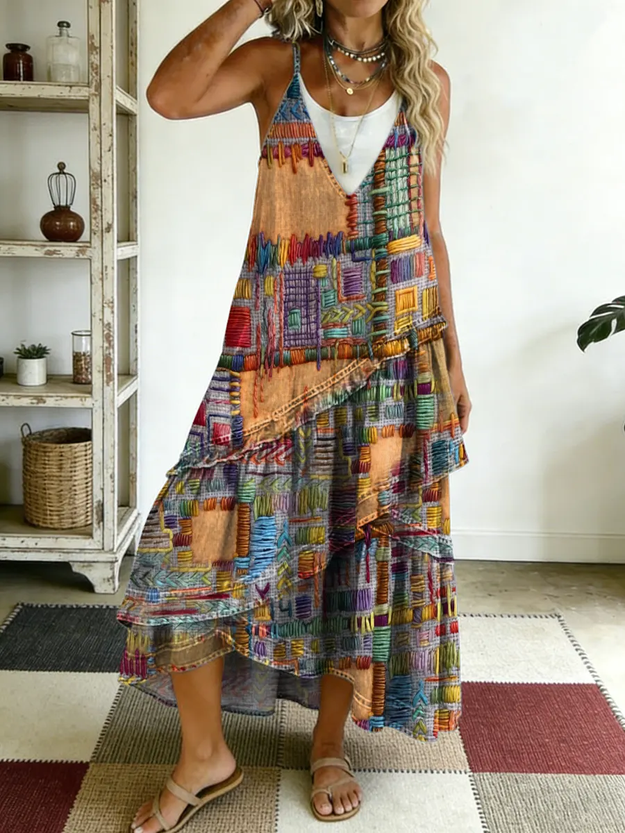 Women's Ethnic Patchwork Print Ruffled Irregular Hem Dress – lolonb