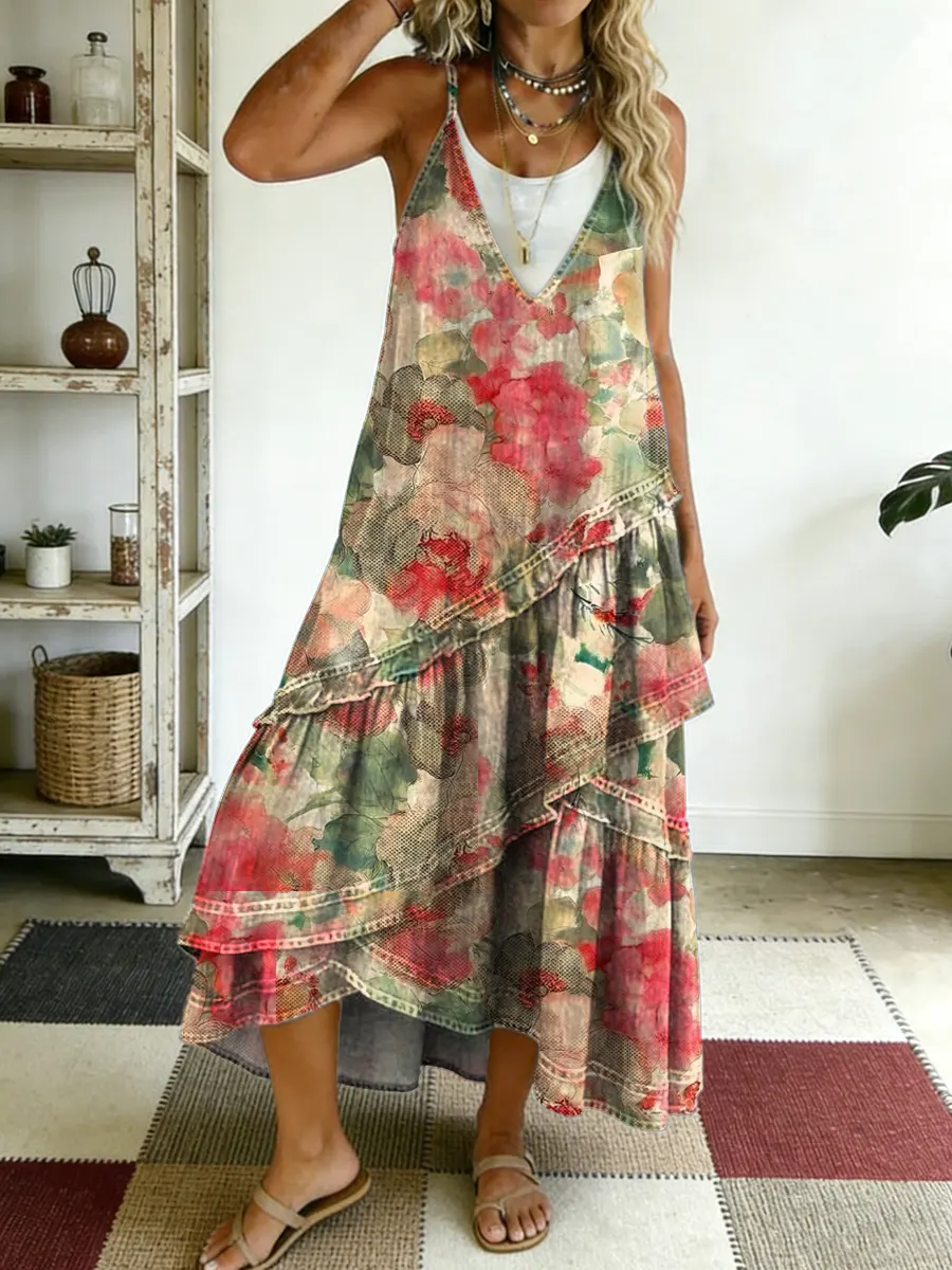 Women's Floral Art Print Ruffled Irregular Hem Dress – lolonb