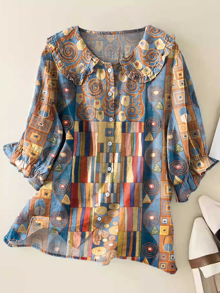Women's Geometric Pattern Art Print Casual Peter Pan Collar Cotton Shirt