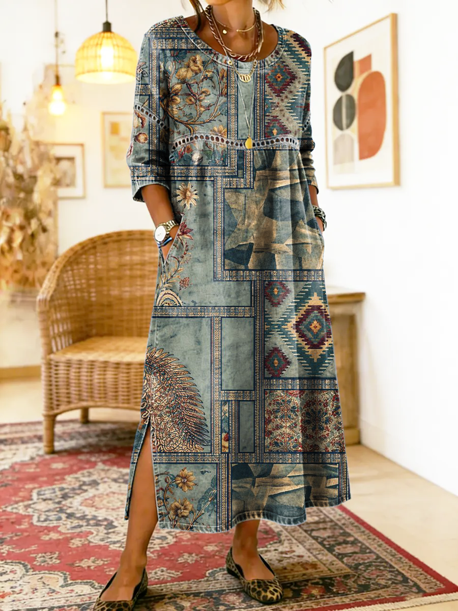 Women's Retro Art Print Casual Round Neck Hollow-out Washed Cotton Denim Dress