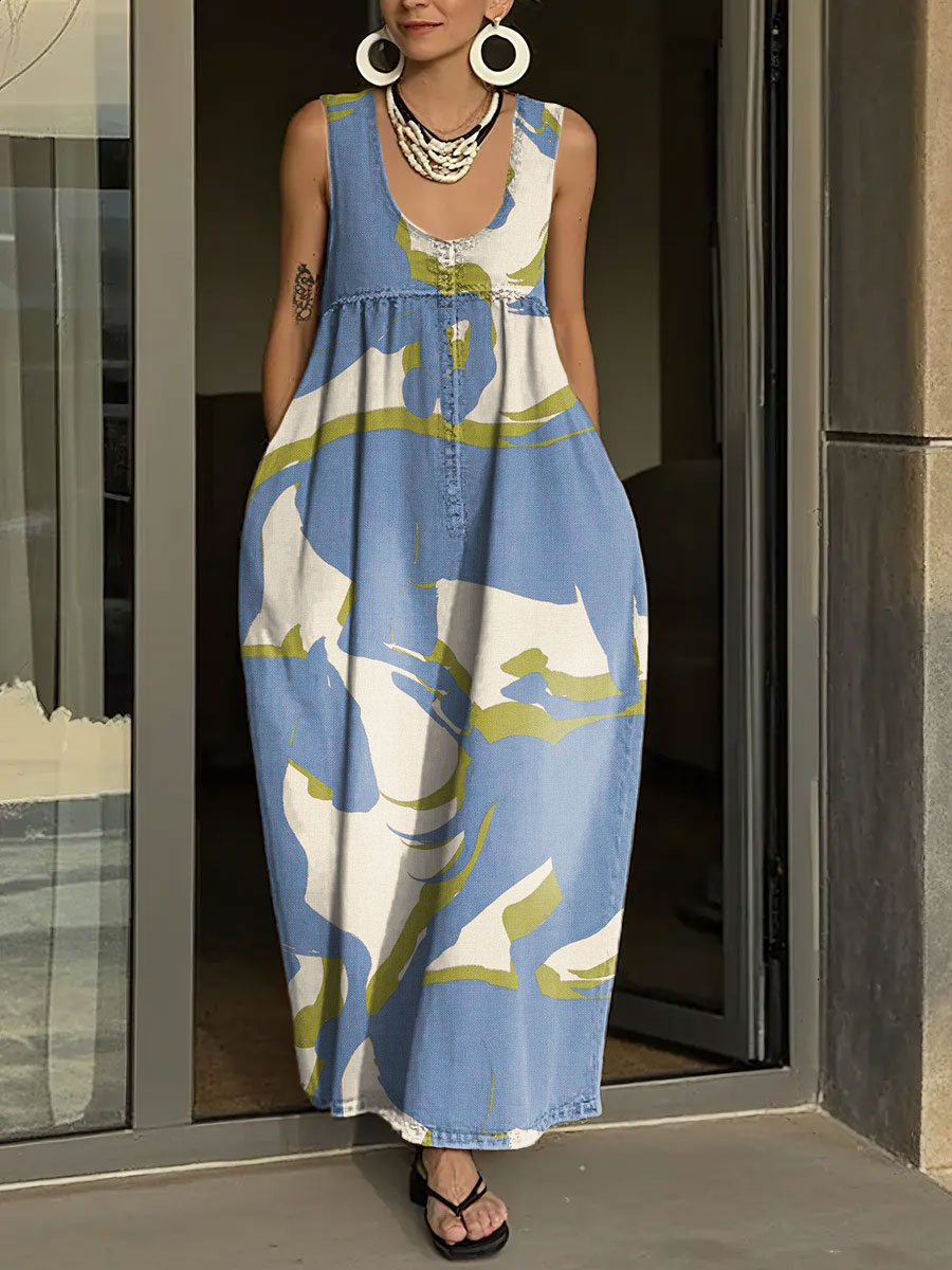 Women's Simple Flowers Pattern Art Print Casual Cotton Denim Dress