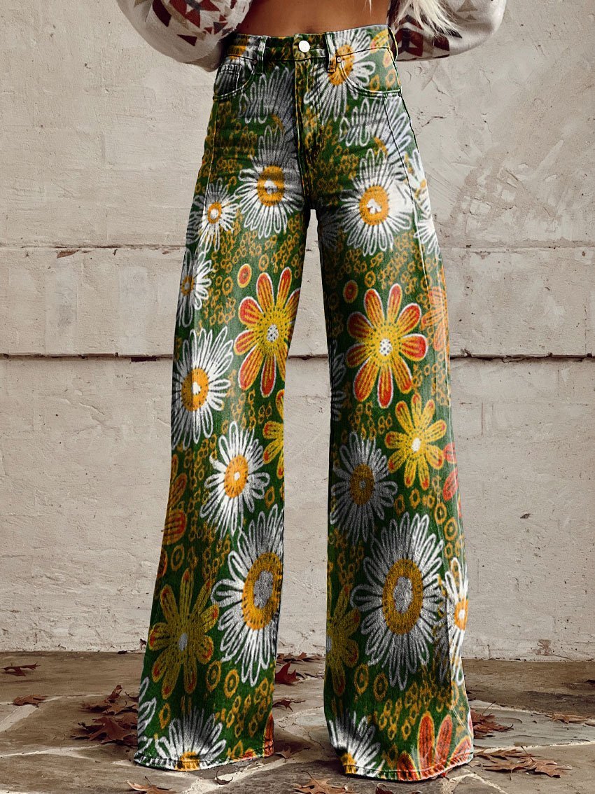 Women's Vintage Flower Daisy Print Casual Wide Leg Pants