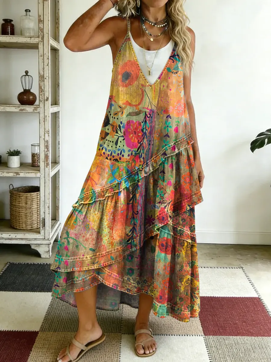 Women's Watercolor Floral Art Print Ruffled Irregular Hem Dress – lolonb