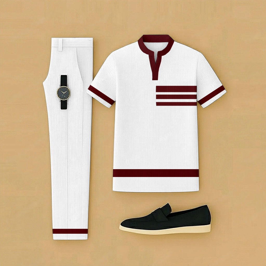 Men's Casual White & Burgundy Color Matching Short Sleeved Henry Collar T-Shirt & Trousers Two-Piece Set
