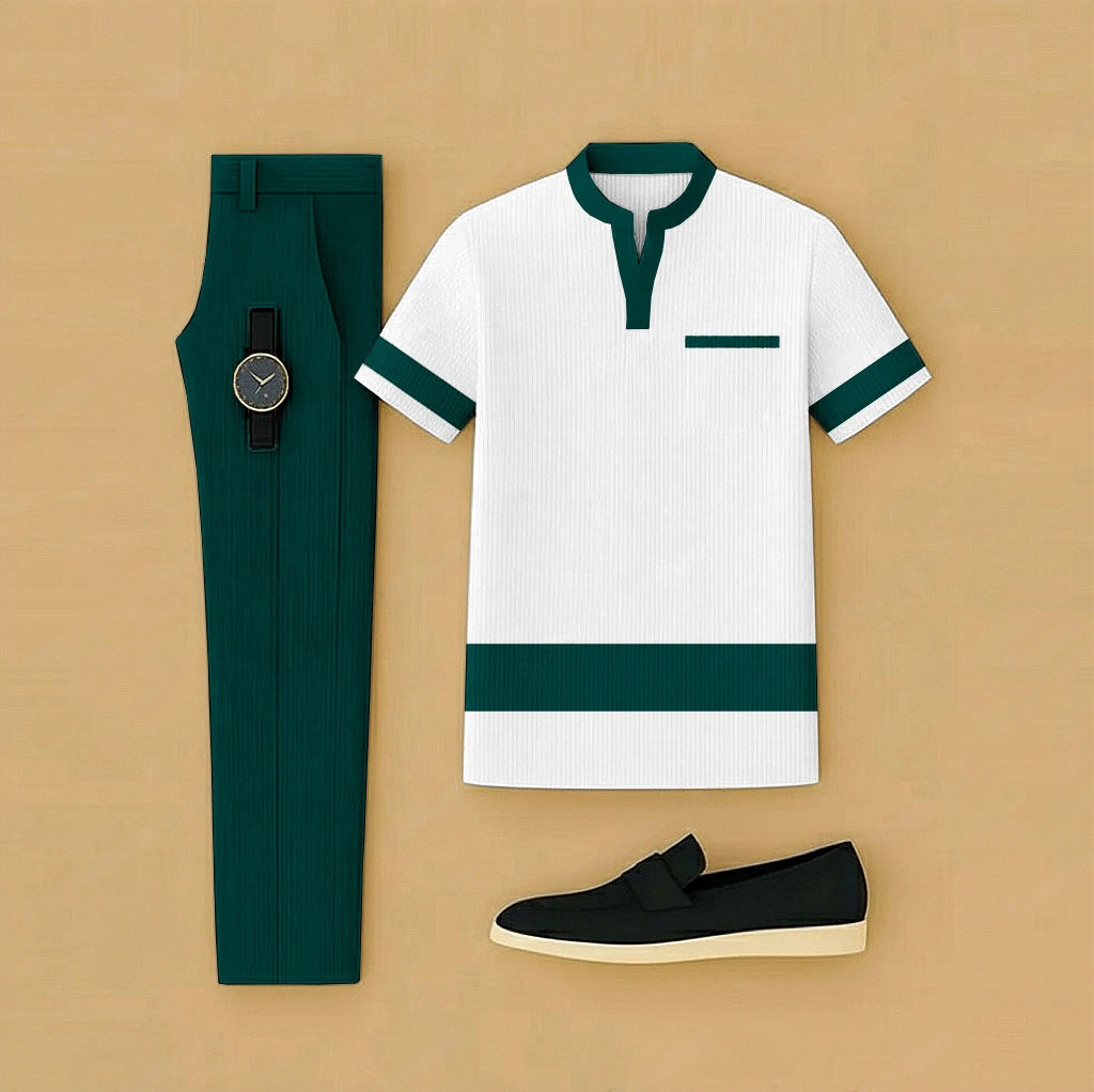 Men's Casual Dark Green & White Color Matching Short Sleeved Henry Collar T-Shirt & Trousers Two-Piece Set